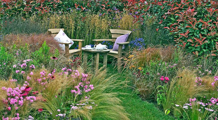 Сады часто делят на зеленые комнаты, в которых есть где отдохнуть на свежем воздухе. Такие посадки обрамляют окантовкой газона и мульчей