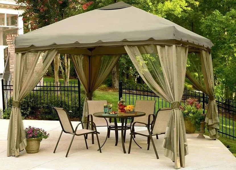 Имеется масса тканей, которыми можно из беседки сделать «конфетку». А вариантов их исполнения еще больше, так как каждая постройка требует индивидуального подхода.