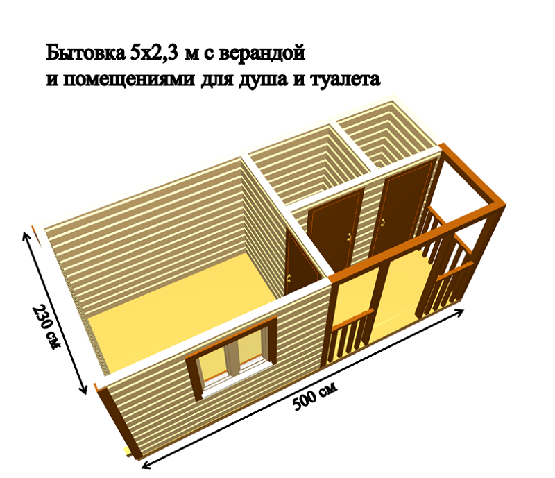 Дачная двухкомнатная бытовка с туалетом и душем: размеры и планировка