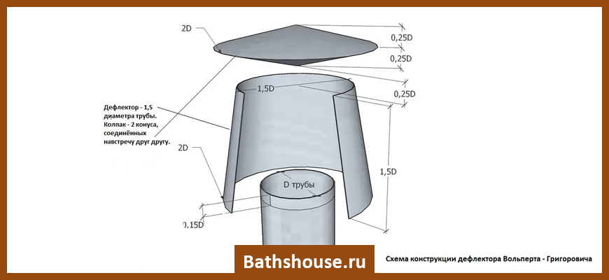 При изготовлении устройства самостоятельно необходимо строго придерживаться пропорций, указанных выше. Если дефлектор, устанавливаемый на дымоход, не будет соответствовать этим параметрам, то и свою основную функцию по созданию хорошей тяги он выполнять должным образом не сможет.