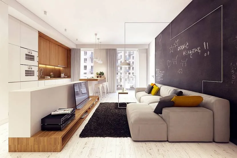 Масштабная грифельная стенка в гостиной комнатеИсточник howmeb.com