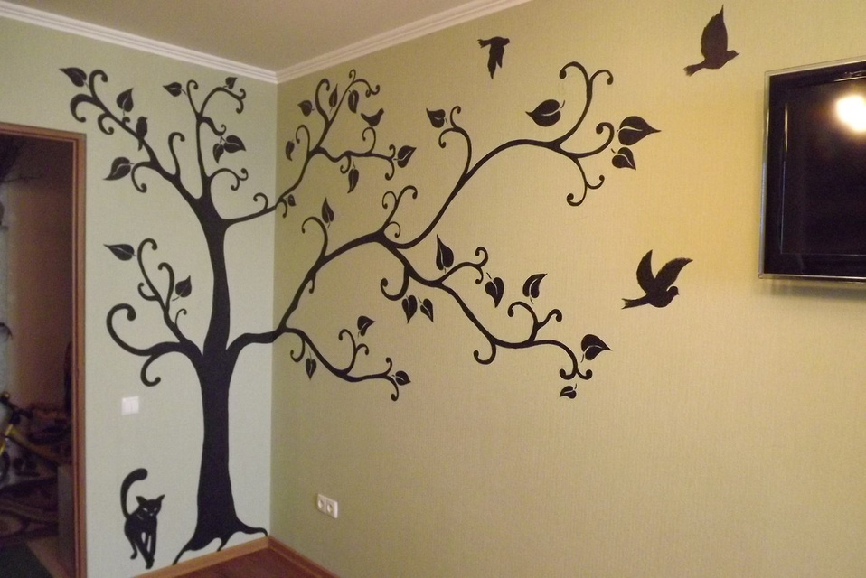 Причудливые орнаменты, ветка барбариса или сирени, пейзажи, отдельные образы в центре стены и рисунки во всю ее площадь – краски, фантазия и умение держать кисточку позволяют воплотить своими руками все. Самобытность, оригинальность и неповторимость в дизайне будут гарантированы.