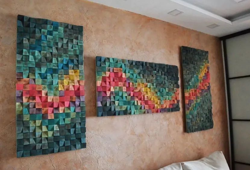 Модель с авторской доработкой кистью. При использовании данного способа декорирования дизайнеры рекомендуют приобретать не менее чем 6-9 узких картин. Все они изготавливаются из дерева. Для оформления в стиле hand-made задействуют яркие краски.