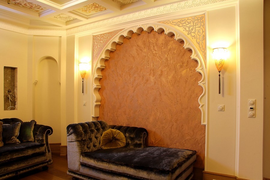 Фактурная штукатурка под «ткань» — позволяет оформить помещение в восточном/классическом стиле при минимальных денежных затратах. Ее особенностью можно считать устойчивость к истиранию, к солнечным лучам, не подвержена растрескиванию, просто восстанавливается и имеет огромный срок эксплуатации. Наиболее популярна имитация замша или шелка.