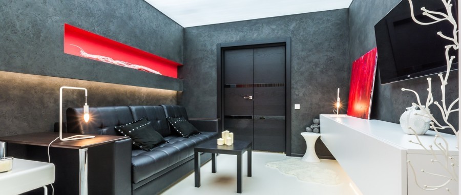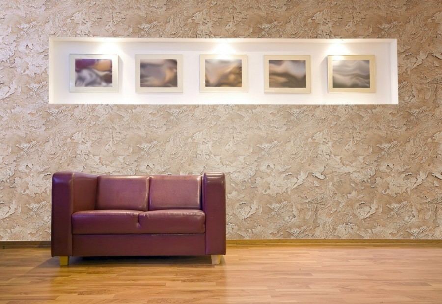 В гостиной декоративную штукатурку можно сочетать с другими видами отделки, например, обоями или панелями из дерева. Для небольшой по площади комнаты лучше выбрать состав светлого тона со светоотражающими свойствами. Изысканности гостиной добавит венецианская штукатурка с серебристым, золотистым отблеском или синим.