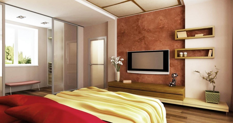 Спальня должна располагать к покою и сну. Отдайте предпочтение пастельным, приглушенным оттенкам. Выбирая смесь с крупными фракциями, можно создать объемный эффект, подчеркнуть архитектурные особенности интерьера.