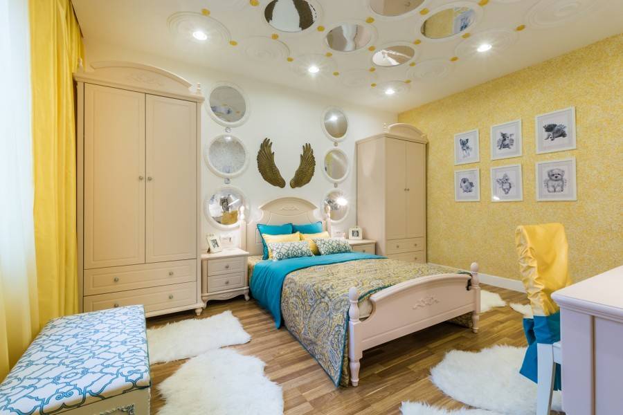 Другое достоинство -это возможность применять её для любых видов стен и даже потолка. Ведь нет правила, что он обязательно должен быть ровным и белым. Его также можно сделать фактурным и цветным, шёлковым или бархатным