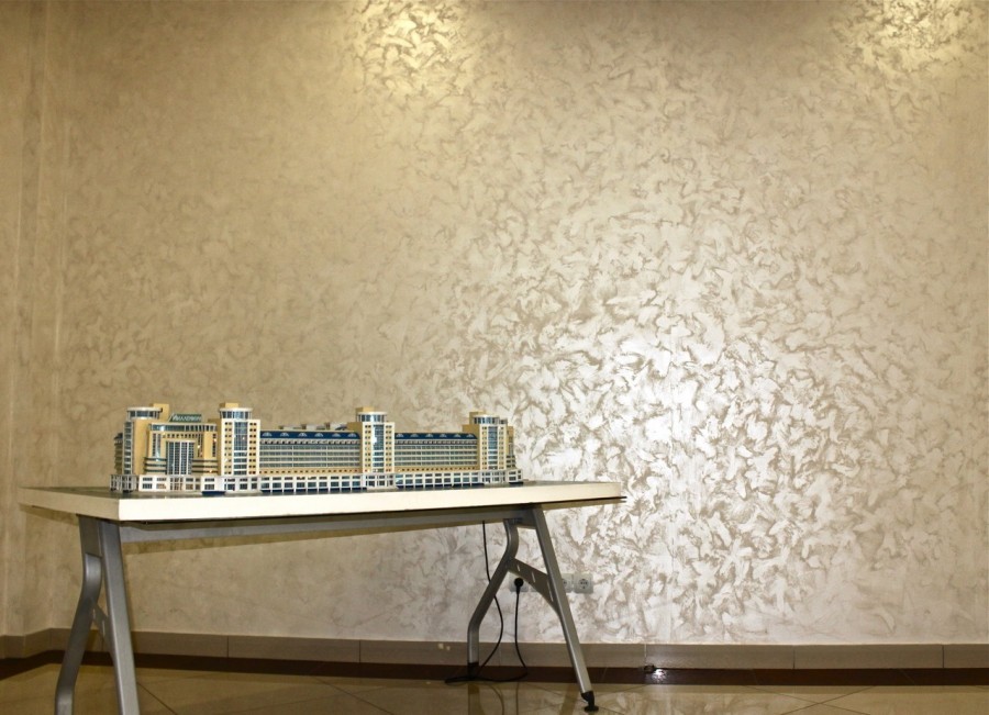 В составе смеси присутствуют перламутровые частицы. Они имитируют перелив легких тканей. Это оптимальный вариант для отделки спальни, гостиной и кухонного помещения.