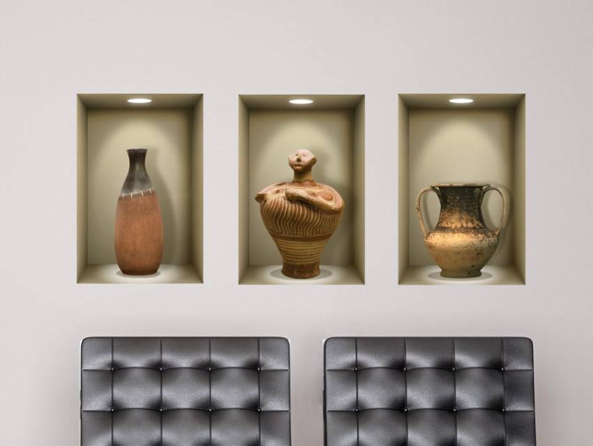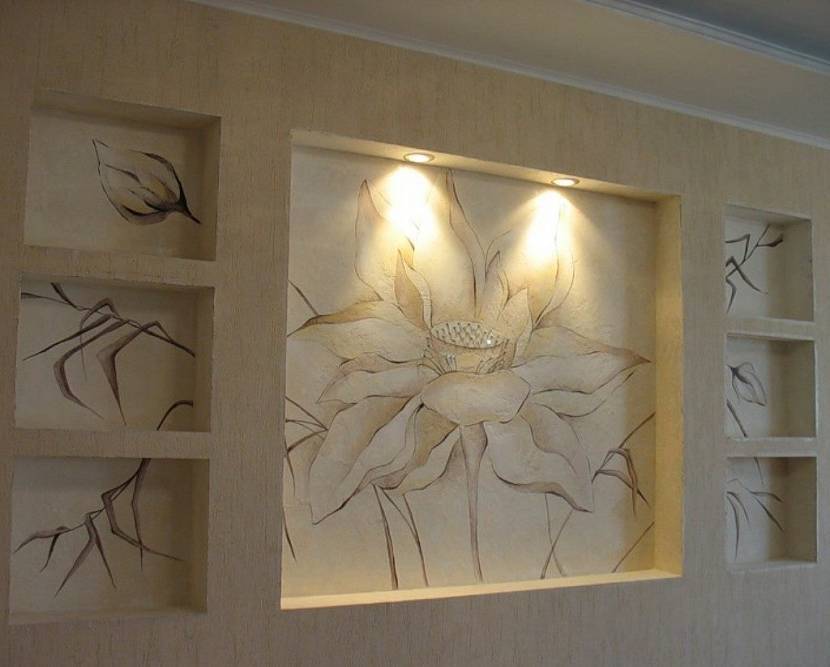 Неглубокую конструкцию используют в качестве декоративного элемента. В нее помещают картины, панно и фрески. Если правильно оборудовать подсветку, поместить на выступ вазон или статуэтку, можно сделать из углубления необычный и эффектный арт-объект.