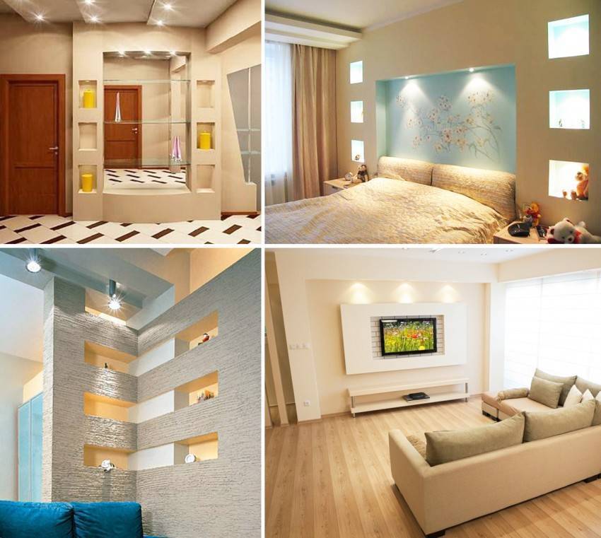 Можно воплотить в жизнь всевозможные дизайнерские решения и сконструировать различные декоративные ниши, придающие интерьеру особую уникальность.
