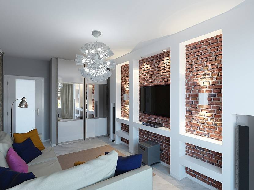 Задействовать для размещения телевизора и другой техники. Легко можно скрыть провода и кабели, эффектно зонировать пространство.