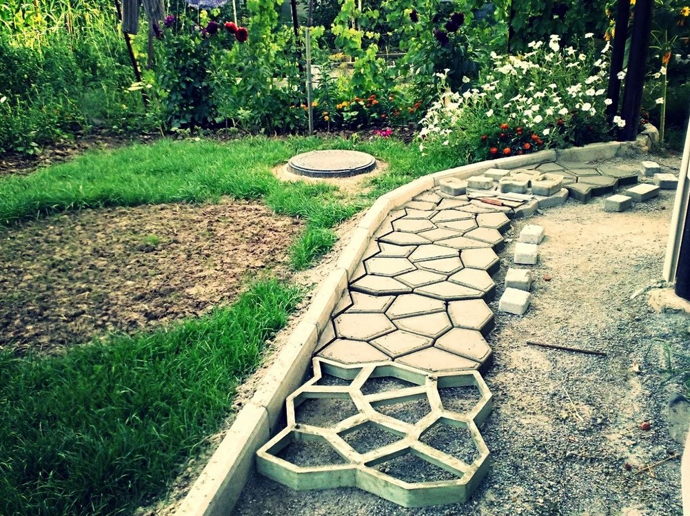 При устройстве новых дорожек камни устанавливают сразу. Производят трамбовку подготовленных канав, сыплют песок либо щебень, затем его уплотняют. Далее занимаются монтажом опалубки с краев траншеи. После подготовки опалубку заливают бетонной массой. Производят уплотнение смеси, затем верх ровняют шпателем. Через трое суток снимают щиты. Преимуществом литьевого камня является отсутствие швов.