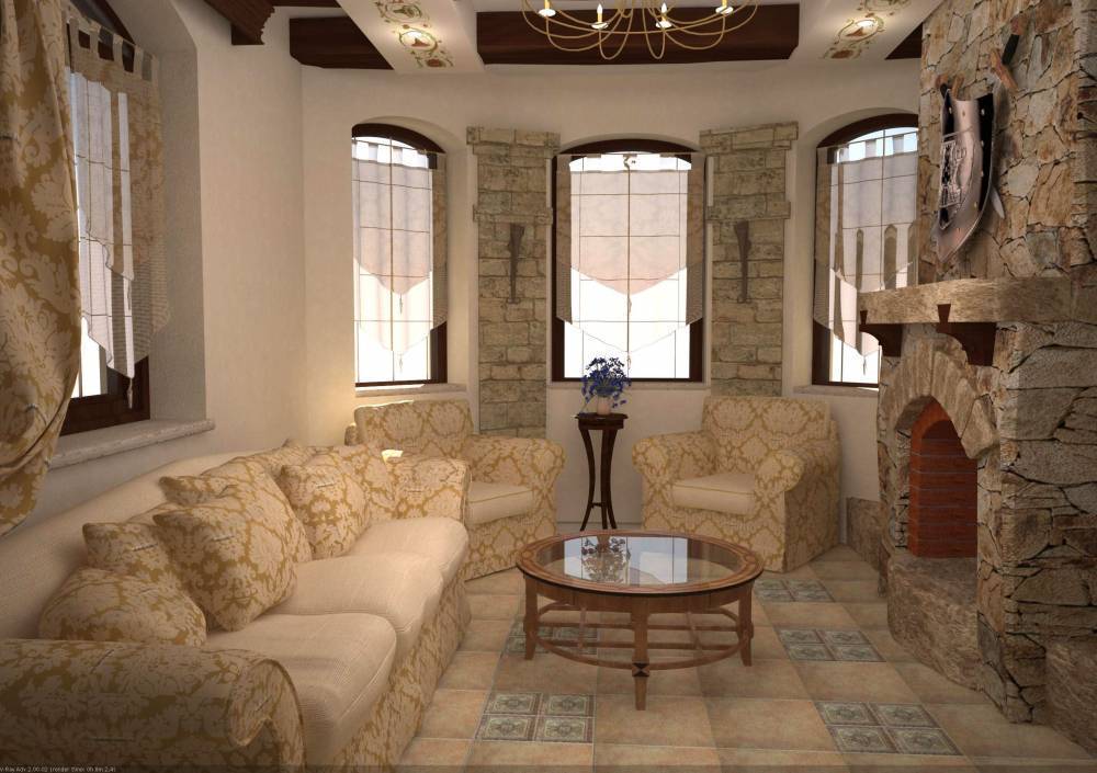 Это помещение, где собираются гости, — оно должно быть уютным и располагать к длительным беседам у теплого камина. Здесь самым приемлемым вариантом будет искусно отделанный интерьер в стиле древнего замка: с каменными полами и открытыми массивными потолками из натурального дерева.