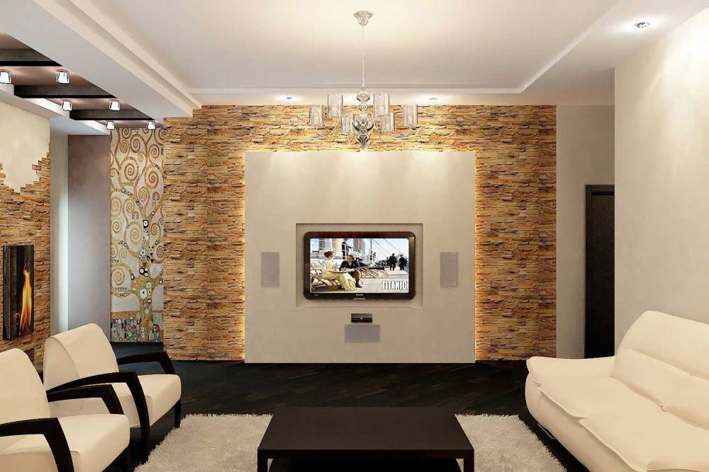 Искусственный камень органично впишется и в интерьер гостиной комнаты