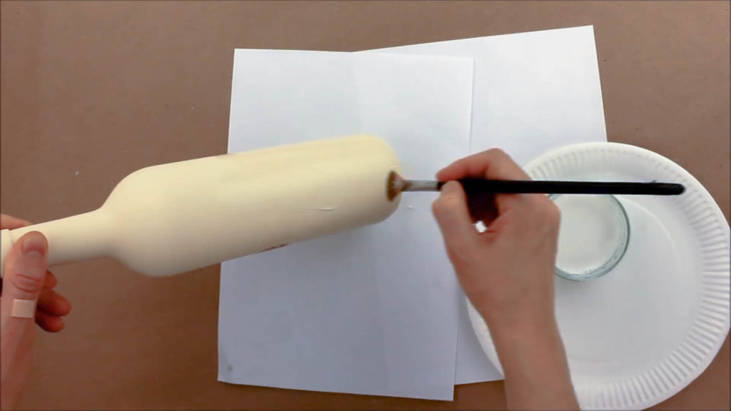 На подготовленную сухую обезжиренную поверхность бутылки накладывается такая же сухая салфетка, а затем по ее поверхности начинает «гулять» кисточка с подобранным заранее клеем