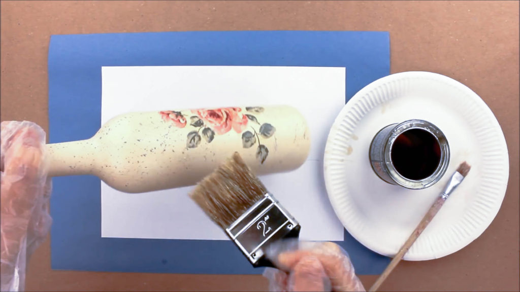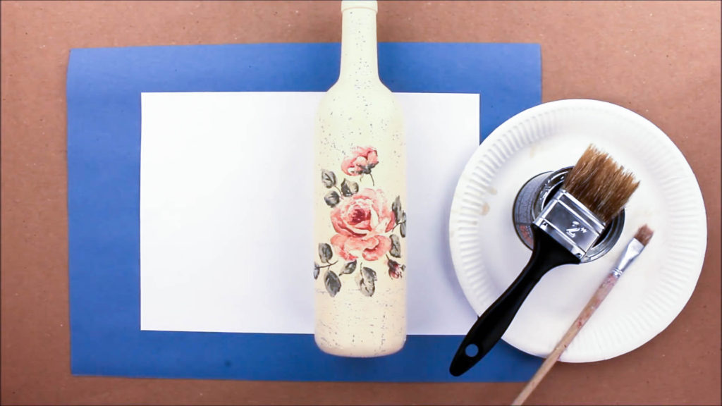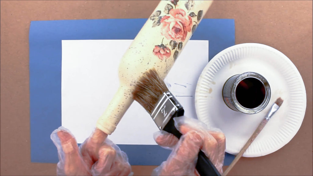 В этом уроке я применяю обычный прозрачный акриловый лак. Но также можно сделать декупаж бутылок салфетками своими руками с кракелюром, чтобы придать поделке состаренный вид. Этот лак создает эффект треснутой от старости краски.