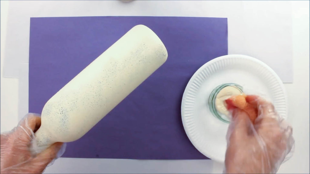 Важно, чтобы через бумагу не просвечивалось стекло, поэтому может понадобиться несколько слоев материала. Каждый слой обрабатывается губкой с клеем. Таким образом обворачиваем всю бутылку до самого горлышка
