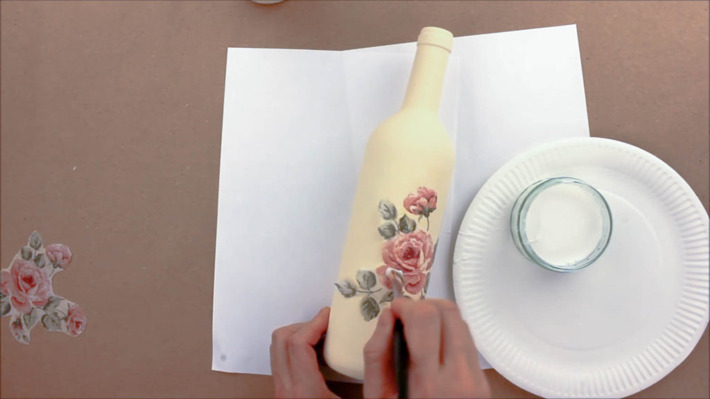 Еще раз смазываем клеем всю бутылку, осторожно прижимаем рисунок и аккуратно проходим по нему кисточкой, тщательно удаляя из-под салфетки пузырьки воздуха и лишний клей