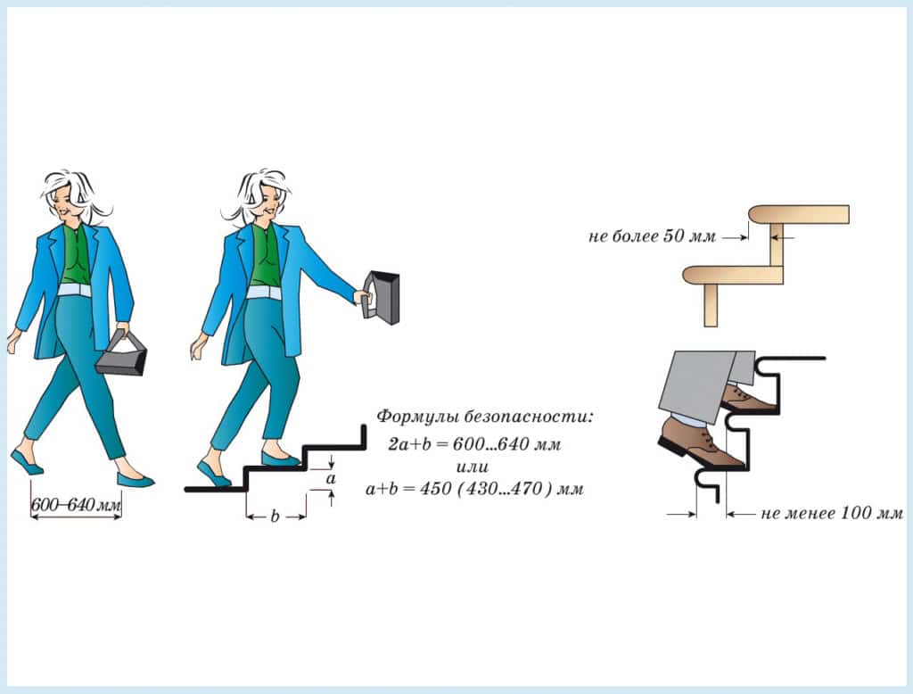 Опытным путем высчитано, что наиболее удобной является лестница, у которой сумма ширины проступи и двойной высоты ступени равна длине шага. Эта формула дает оптимальный угол наклона лестницы.