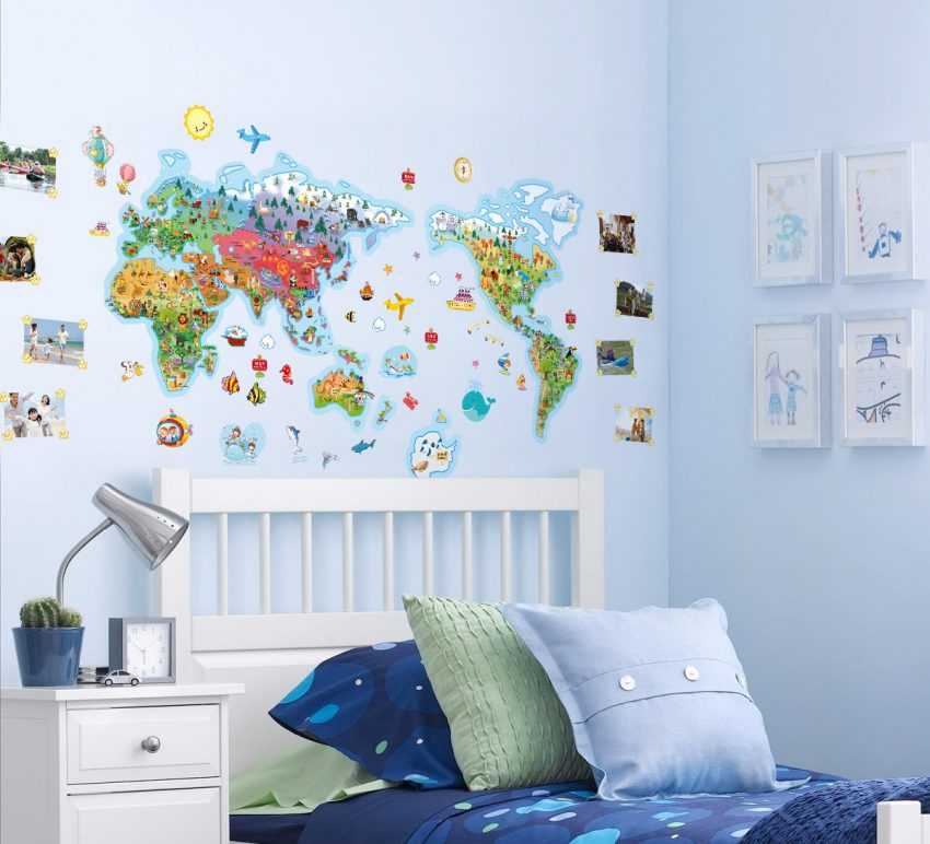 Достаточно часто в интерьере встречается декор в виде различных флагов, например, британского или бразильского. Для любителей техники можно использовать корабельные и самолетные модели. А для мальчиков, интересующихся наукой, подойдет большой аквариум, различные коллажи из фотографий, картины, астрономические карт или карты мира.