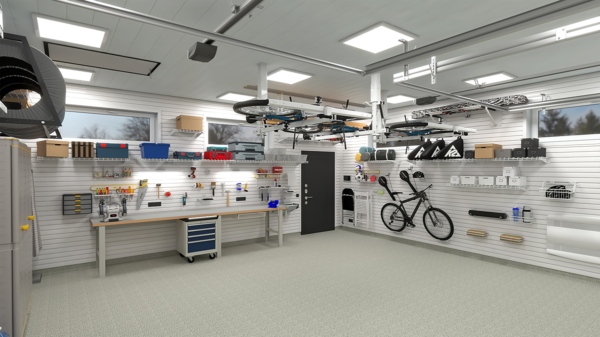 Рабочие зоны гаражного помещения нуждаются в дополнительном освещении. Потребуется лампа, расположенная низко над верстаком. Проследите, чтобы она не слепила глаза. Удачным решением будет выбор прибора на кронштейне, который можно передвинуть в нужную сторону.
