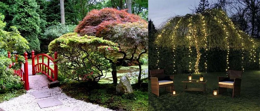 В оригинальном китайском ландшафтном дизайне при выборе растений важна символика. Так, персик знаменует счастье, можжевельник ― здоровье, а жёлтые растения дарят жизненную энергию. Если же сосредоточиться на эстетике, можно выбрать чайные розы, пионы, нарциссы, можжевельники, плодовые кустарники и деревья ― вишню, сливу, а также хвойные деревья.