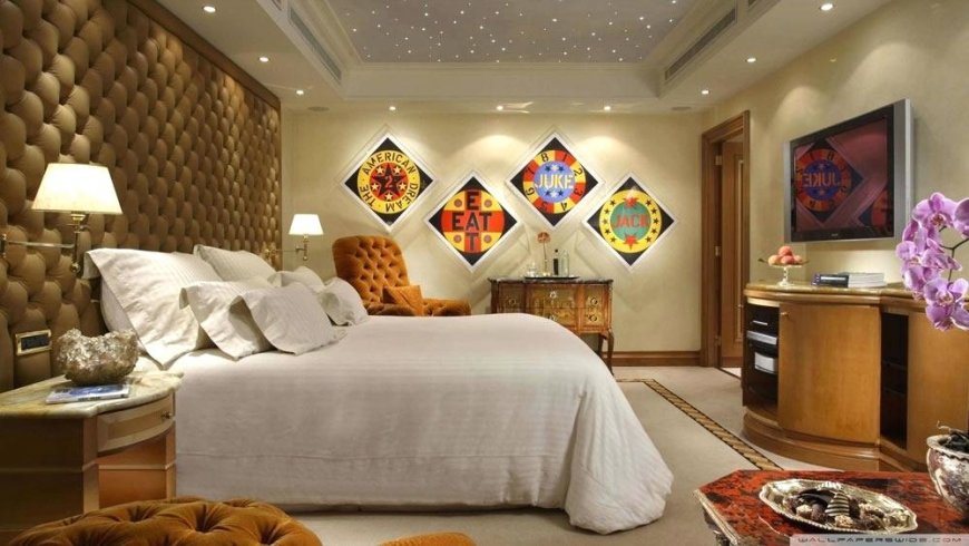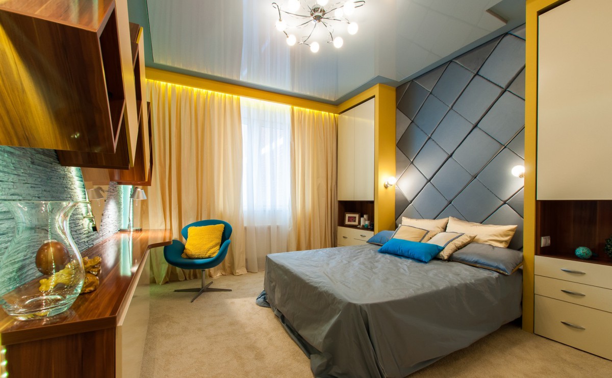Низкий потолок оптически приподнимется, если сделать его белым, кремовым или светло-бежевым, по периметру наклеить галтель шириной 25-50 мм и заложить за нее диодную подсветку. Глянцевый натяжной потолок так же создаст ощущение, что спальня в хрущевке стала выше. Здесь можно использовать не только белое, но и цветное полотно, и даже черное, например, для хайтека. Если потолок в спальне в хрущевке будет с рисунком, то в остальной отделке лучше придерживаться монохромности.