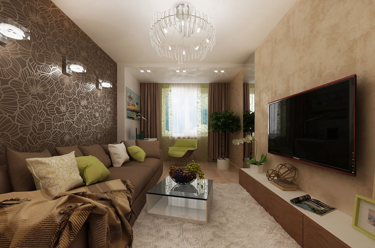 Если ваш зал изначально узкий и вытянутый, применяйте различные техники «раздвижения» стен. Главный секрет в поперечных линиях — укладывайте напольное покрытие перпендикулярно к длинным сторонам, кладите ковры и дорожки, используйте на коротких частях обои в полоску. Крупную мебель для гостиной (шкаф или диван) также не нужно выстраивать вдоль длинной стены.
