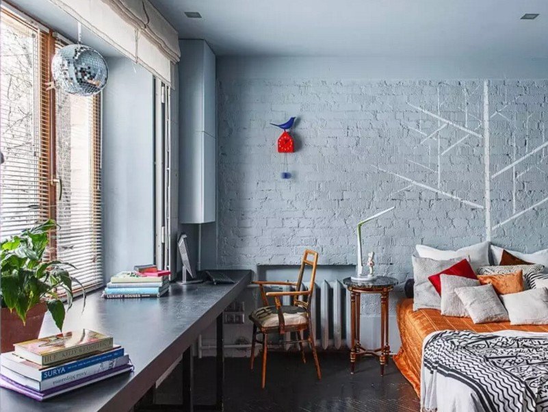Главным элементом дизайна может стать кирпичная кладка или обои с ее имитацией, а также металлические или деревянные полки и стеллажи, являющиеся отличными перегородками.