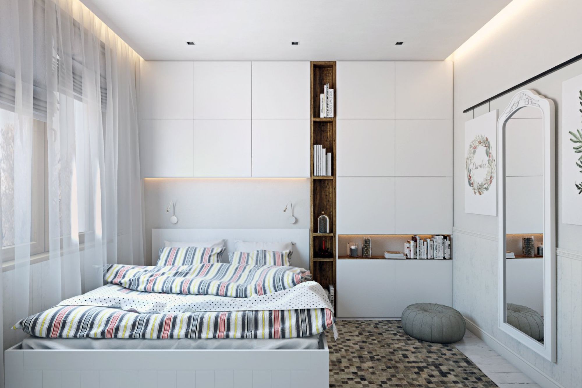 - Встроенный шкаф отлично сэкономит пространство спальни.