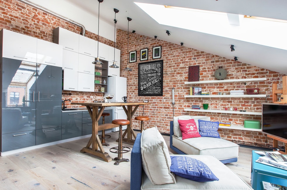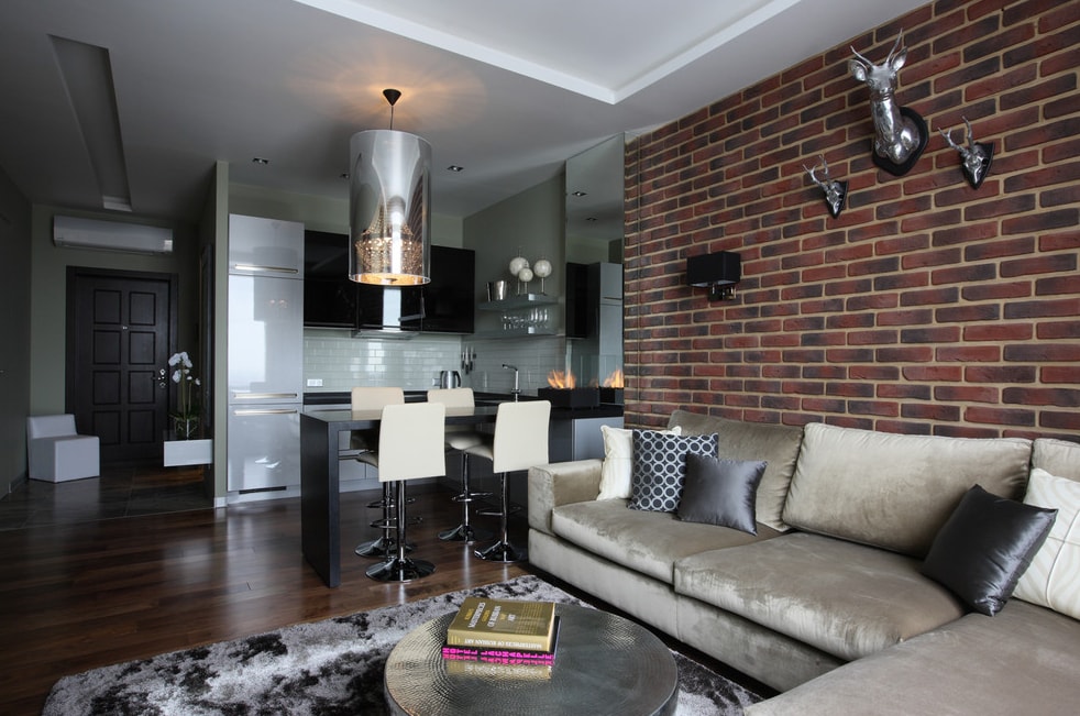 Интересная интерпретация стиля лофт. С одной стороны, кирпичная стена и довольно объемные лампы. Но с другой стороны в этих же лампах внутри спрятаны шикарные хрустальные люстры. А стену украшают голова оленя и рога из железа. В то же время бархатный диван и шелковые подушки и вовсе выбиваются из привычного понимания стиля лофт. Не смотря на все эти противоречия, дизайн интерьера выполнен прекрасно и кухня-гостиная выглядит очень стильно, привлекательно и необычно.
