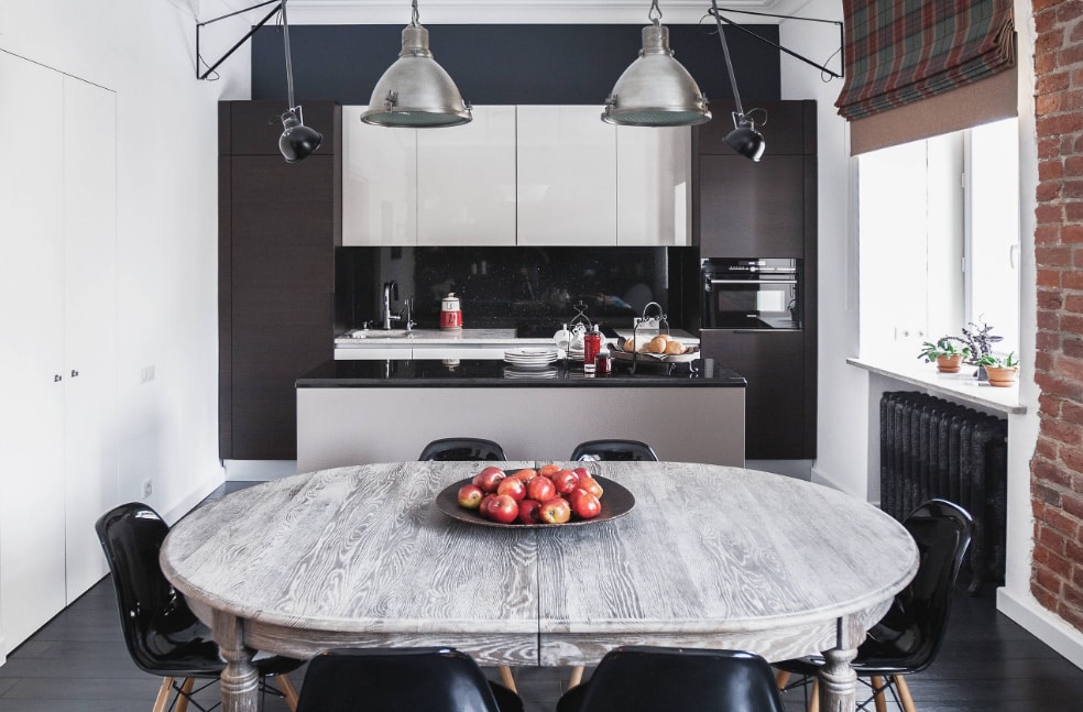 - в большом пространстве обеденный стол нужно разместить между барной стойкой и диваном;