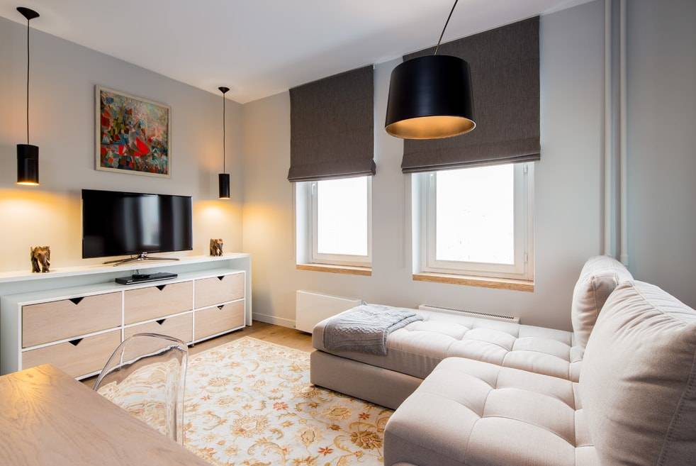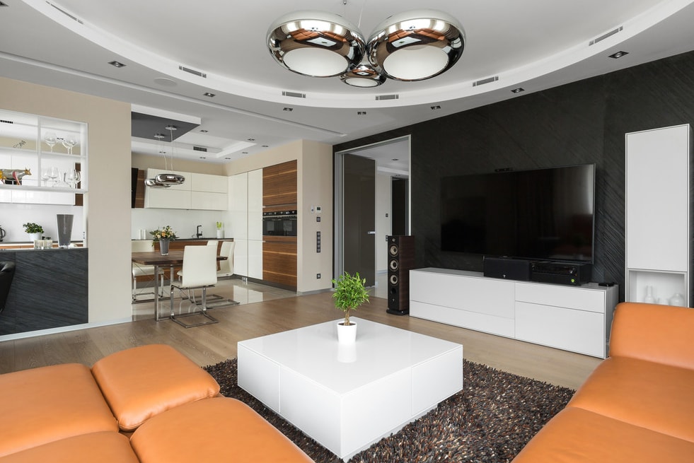 При установке светильников и ламп руководствуются несколькими критериями. Важно, чтобы свет равномерно падать на все пространство. Особенно яркое освещение предпочтительно в кухонной зоне и там, где установлен обеденный стол. В гостиной дизайнеры создают приглушенную атмосферу, используя настенные светильники и настольные лампы. Многоуровневые натяжные потолки со светодиодной лентой тоже хорошо смотрятся в этой комнате.