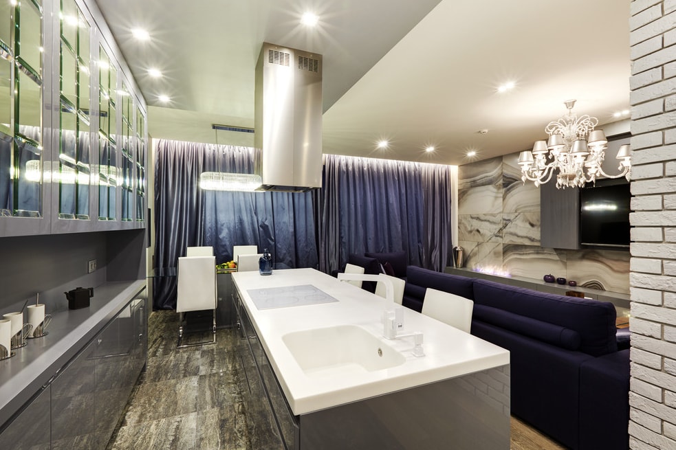 Несмотря на то, что кухня-гостиная совмещенная, используются две довольно массивные люстры, которые при этом одинаковые. Бесспорно, выглядит это очень стильно.