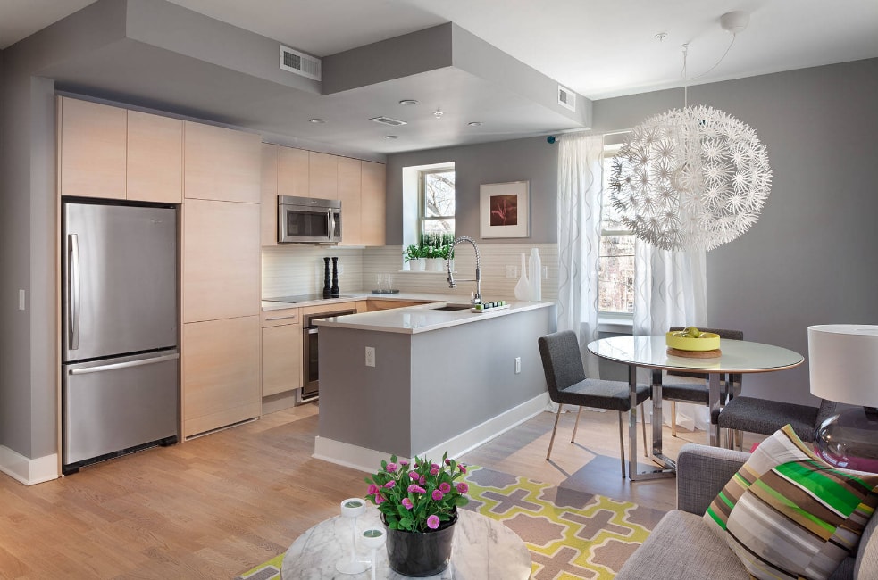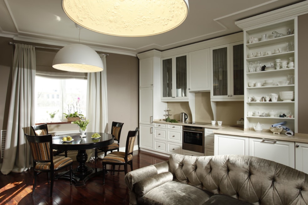 Помещение станет более просторным, что важно для небольших квартир. Появится дополнительная возможность для обстановки, например, можно будет установить большой стол, уютный диван и другую мебель, которая не поместилась бы на кухне и была бы лишней в гостиной