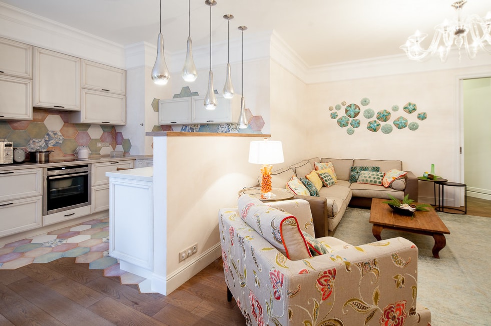 Для визуального разделения кухни, совмещенной с гостиной используют: