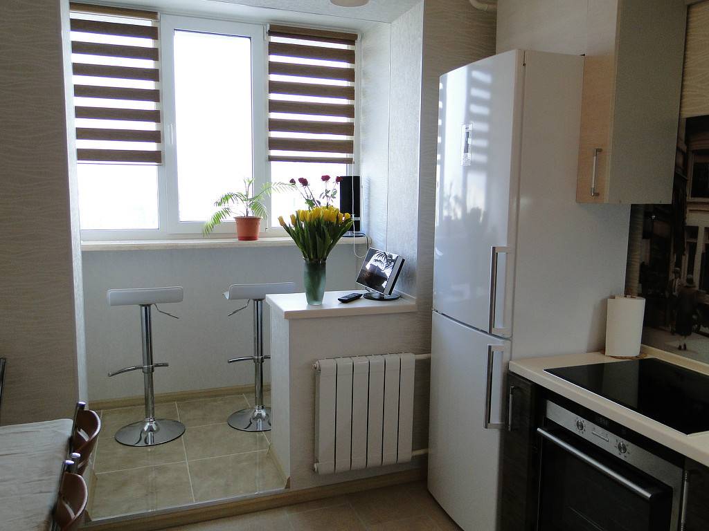 Благодаря объединению балкона и кухни, небольшое помещение для приготовления пищи приобретает большую площадь.