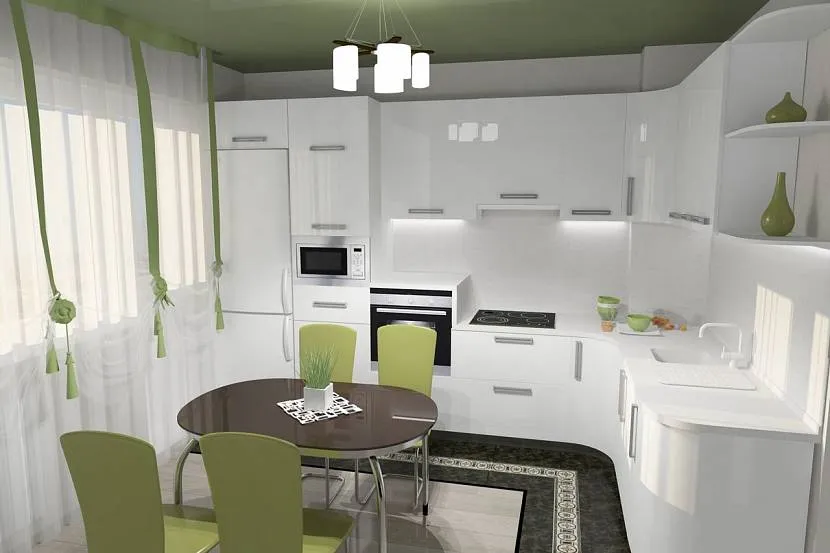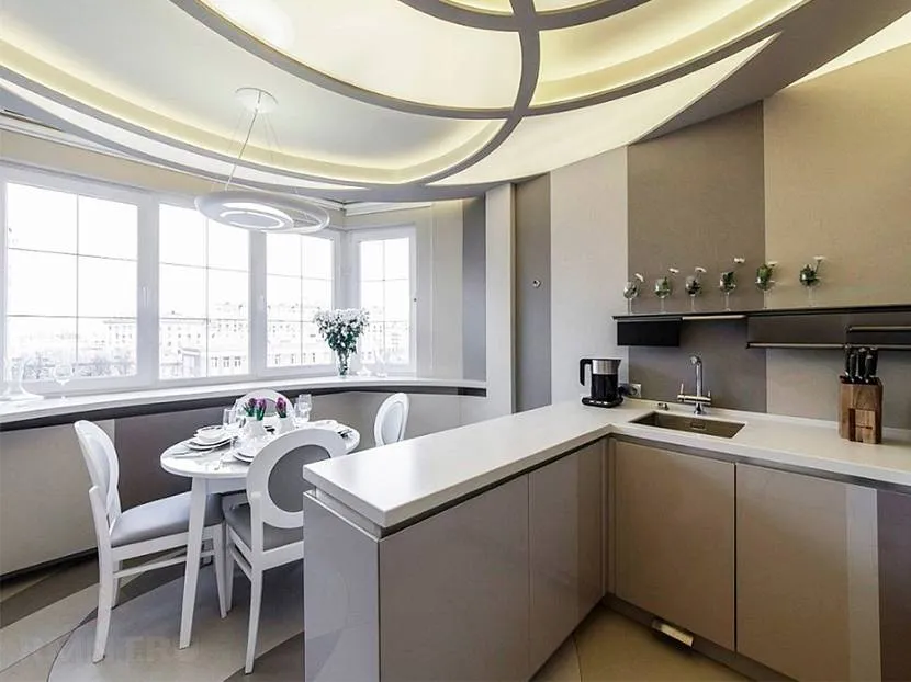 Если у вас панорамное остекление или вид из окна «ну очень красивый», то на кухню переносится именно обеденный стол. Однако для того, чтобы оформить эту зону, необходимо сделать интерьер кухни как можно более светлым, а лучше в белых тонах. Таким образом она будет визуально шире, просторнее, а главное, будет способствовать хорошему аппетиту.