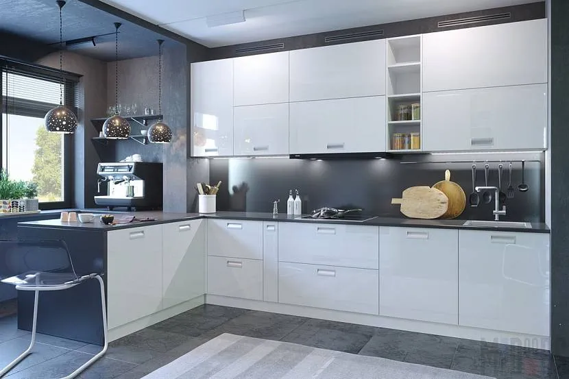 Г-образный гарнитур остается оптимальным решением. Здесь уже невозможно установить П-образный комплект, так как убирается окно. Впрочем, можно оставить простенок, но использовать его в качестве основы для нижних ящиков и столешницы для расширения рабочей зоны