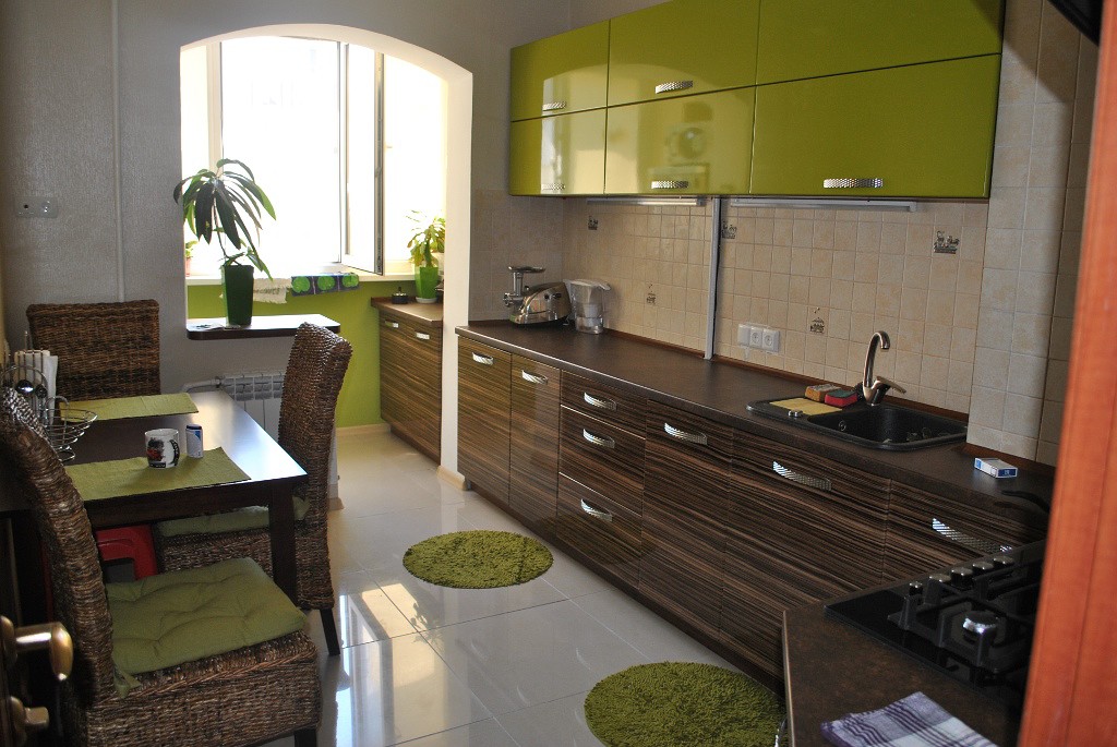 На балкон можно вынести часть гарнитура. Если разместить вдоль окон рабочую поверхность, на неё будет падать естественный свет, облегчая процесс готовки.