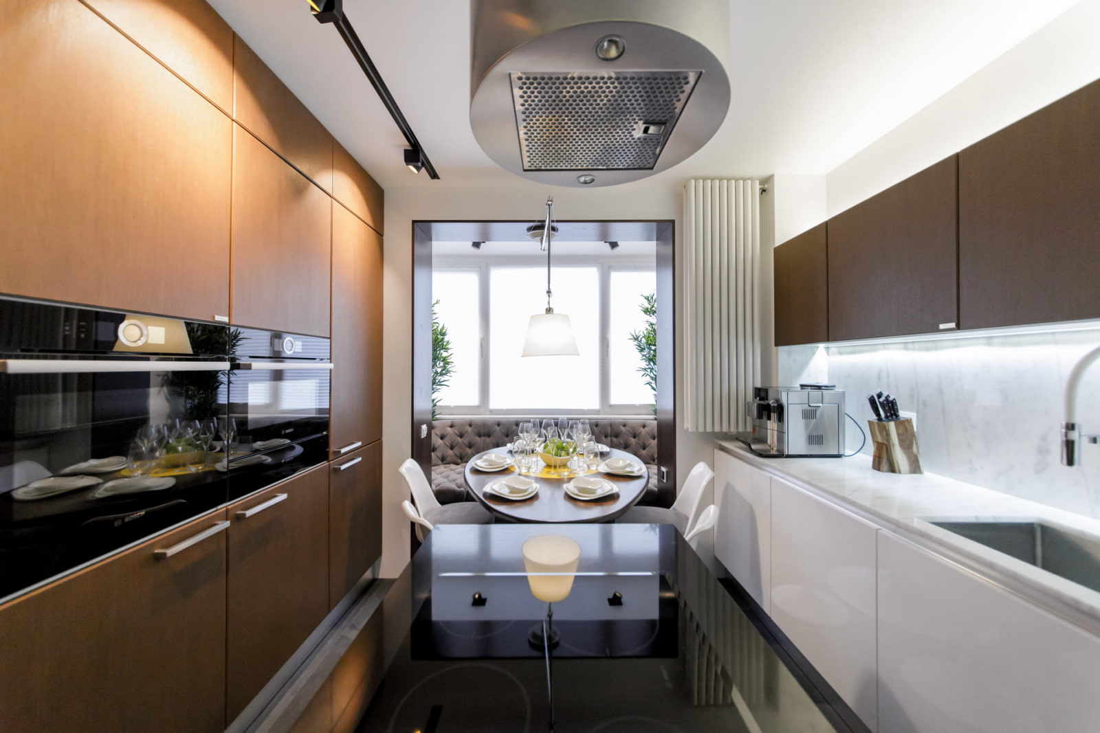 Если балкон или лоджия продолжаются за пределами длинной узкой кухни, то есть имеют вход и из других комнат, целесообразно разделить помещения не только визуально, но и фактически более четкими границами. Конечно, можно оставить проемы на месте либо заменить их легкими перегородками, которые легко трансформируются.