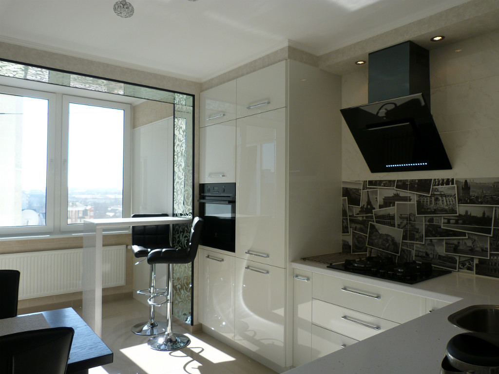 При таком ремонте демонтируется балконный проем с окнами и балконной дверью. На месте бывшего подоконника можно установить барную стойку, которая будет выполнять функцию зонирования. Обычно в таком дизайне кухни на лоджии примыкающее помещение автоматически становится обеденной либо столовой зоной.