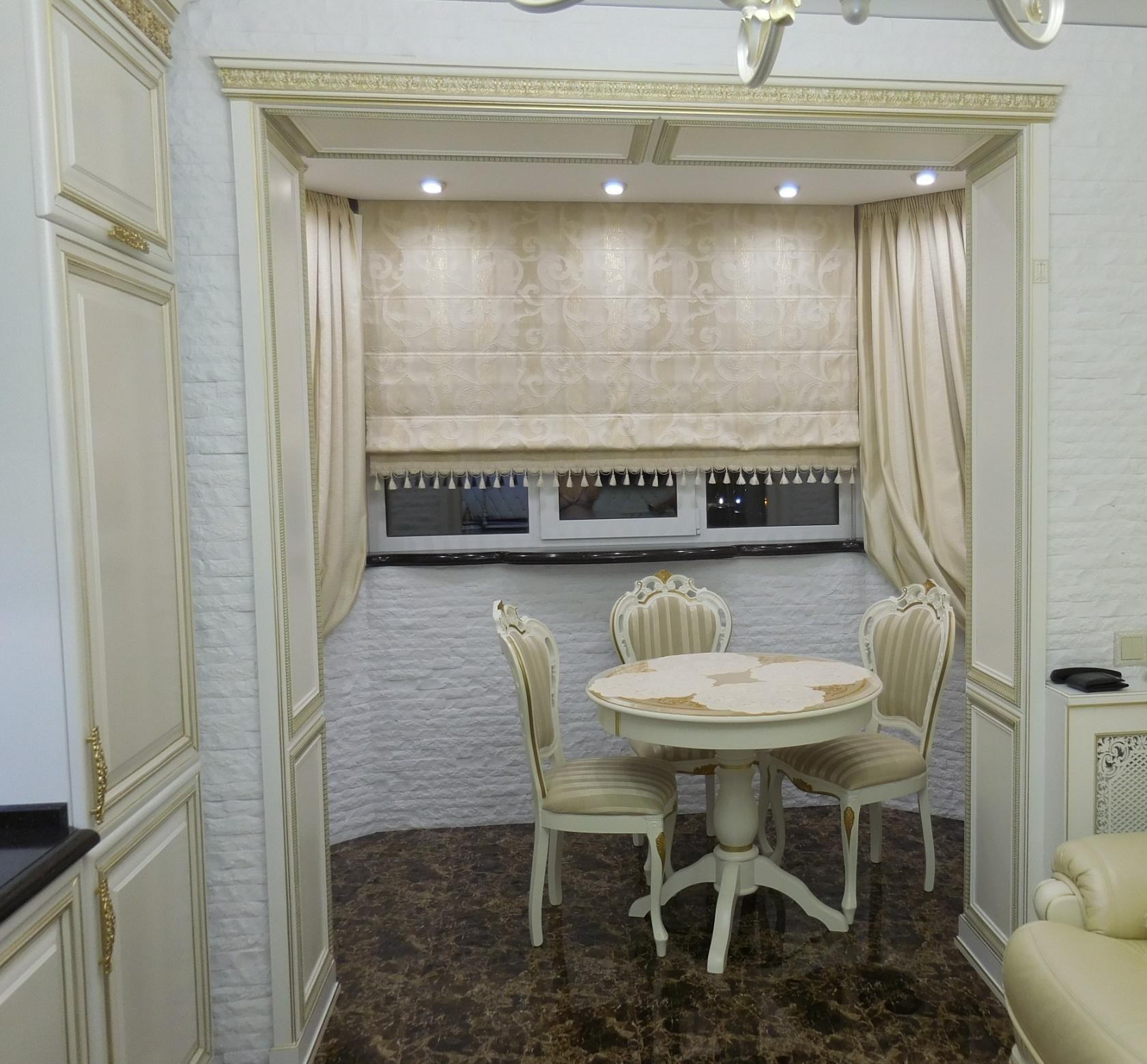 Мастера дизайнерского дела могут предложить ещё один способ, который не потребует никаких работ по демонтажу. Этот вариант подходит для большой лоджии. Именно туда перекочёвывает кухня, а на её месте устраивают столовую. Или, наоборот, на территории балкона размещают столовую, позволяющую принимать пищу и наслаждаться обзором природы за окном.