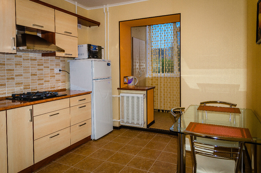 Такую кухню лучше всего объединять с балконом полностью, убирая окна и двери, иначе симметричность и теснота сохранятся.
