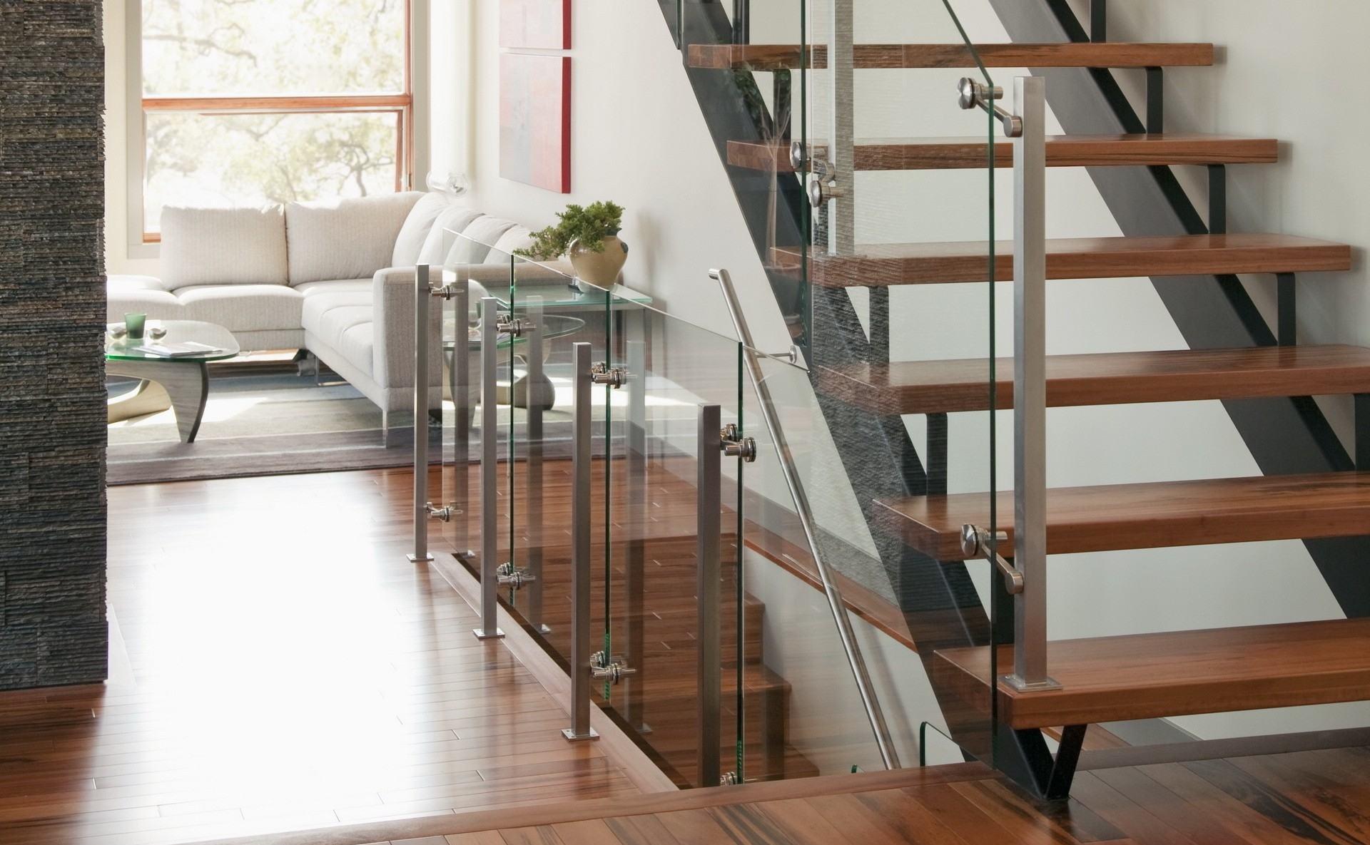 В стиль хай-тек идеально впишется хромированная или никелированная лестница с элементами из стекла или камня. При оформлении прихожей в стиле минимализм выбор стоит сделать в пользу толстой стеклянной конструкции.
