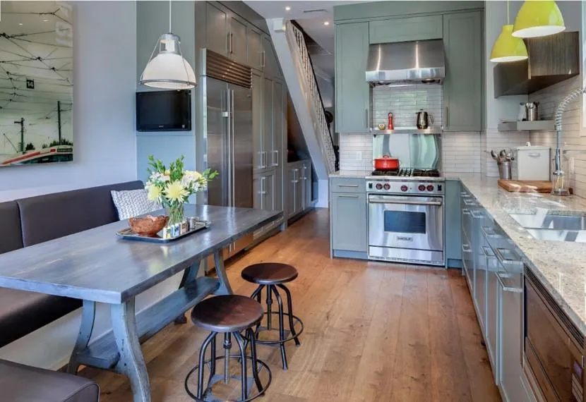 Чаще всего площадь комнаты делят на угловую обеденную зону и рабочую, размещение которых производится в разных сторонах кухни. Также существует вариант дизайна с использованием барной стойки, которая может объединить в себе сразу две функции – выполнять роль обеденного стола и рабочей столешницы.