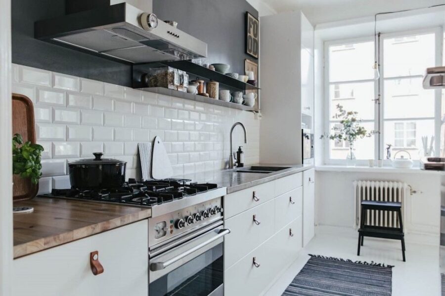 Стилеобразующий цвет скандинавского стиля – белый. Его выбирают как для отделки, так и для мебели. Матовые фасады кухонного гарнитура дополняются прямой фрезеровкой, фартук из белой керамической плитки – черной затиркой. Подойдет столешница и мебель из светлого дерева, стулья и стол с конусообразными ножками.