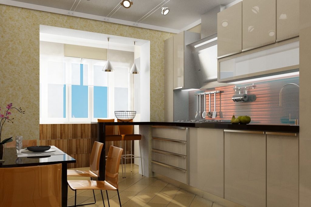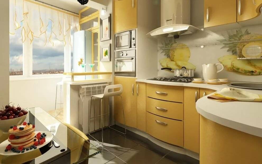 Балкон или лоджию в идеале нужно присоединить к кухне, убрав типовые чугунные батареи и заменив их на современные, компактные. После расширения площади и утепления балконной зоны, можно переходить к разработке дизайна помещения.