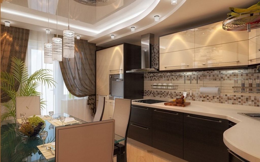 Девятый этаж может стать большим преимуществом при ремонте кухни. Здесь обязательно есть балкон, который можно включить в площадь кухни. Сверху нет соседей, а значит можно выбрать любой дизайн потолка, в том числе самый сложный и дорогой.