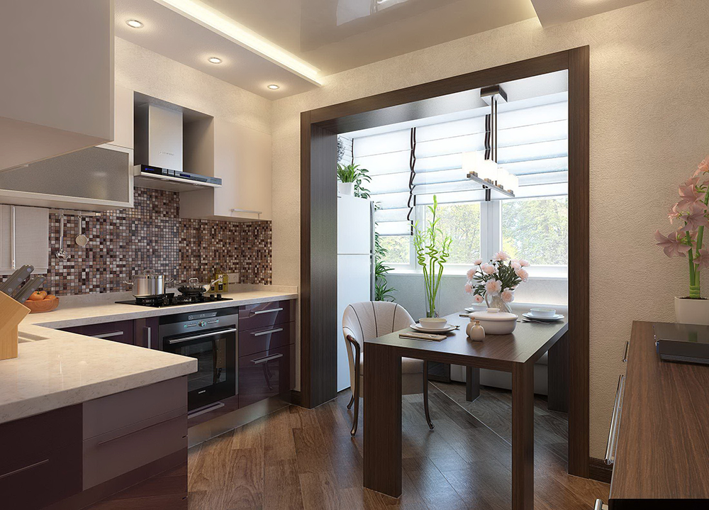 Имеющийся балкон или лоджия также могут быть задействованы, и помогут увеличить полезную площадь. На балконе можно установить тот же холодильник, варочную поверхность, а подоконник между балконом и кухней может превратиться в разделочную поверхность или обеденный столик.
